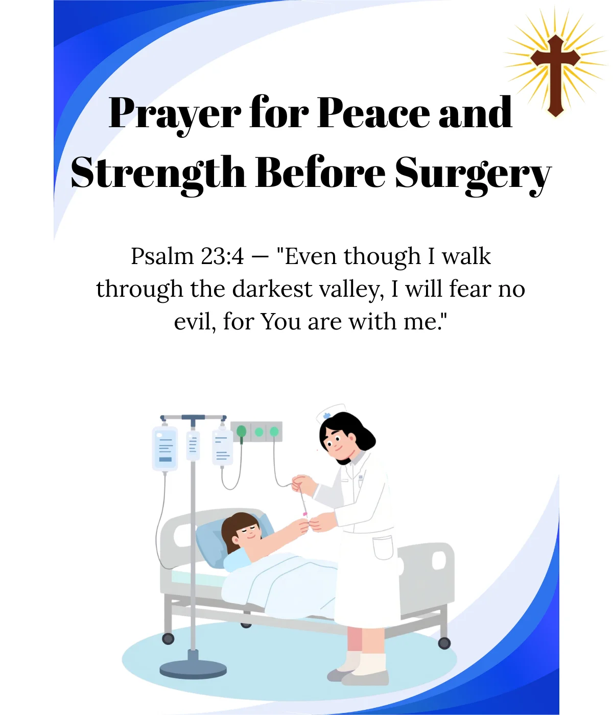 The best prayers before surgery include: a prayer for peace and calm, a prayer for the surgeon’s hands, a prayer for protection and a successful outcome, and a Scripture-based prayer like Philippians 4:6-7 or Isaiah 41:10. Short prayers are just as powerful as long ones — what matters is sincerity and faith.