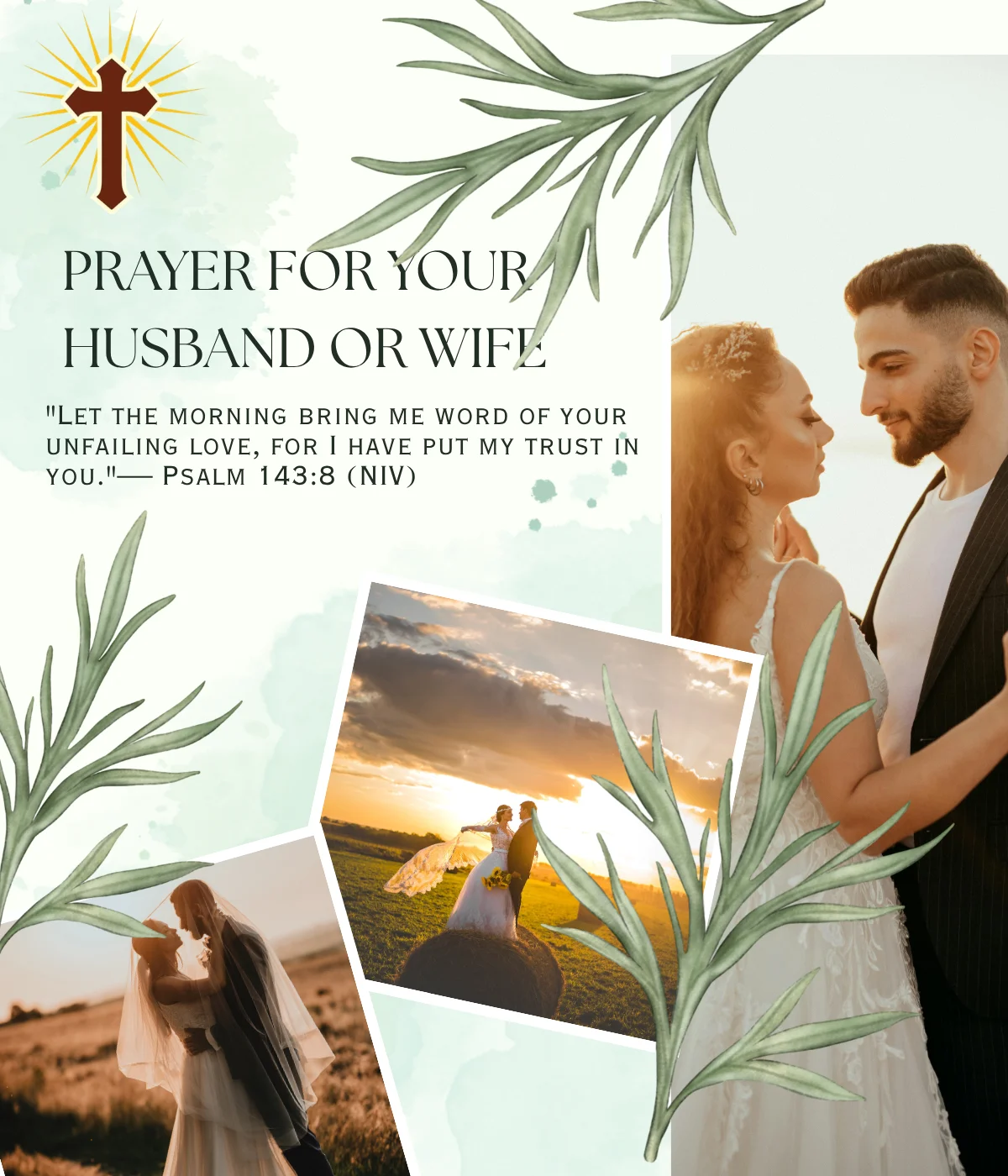 | Lord, As my spouse begins this day, go before them. Guide their thoughts, their words, and their steps. Fill them with Your wisdom and surround them with Your favor (Psalm 90:17).Let them sense Your presence throughout every moment — at work, in traffic, in every interaction. Be their peace and their strength today. In Jesus’ name, Amen. |