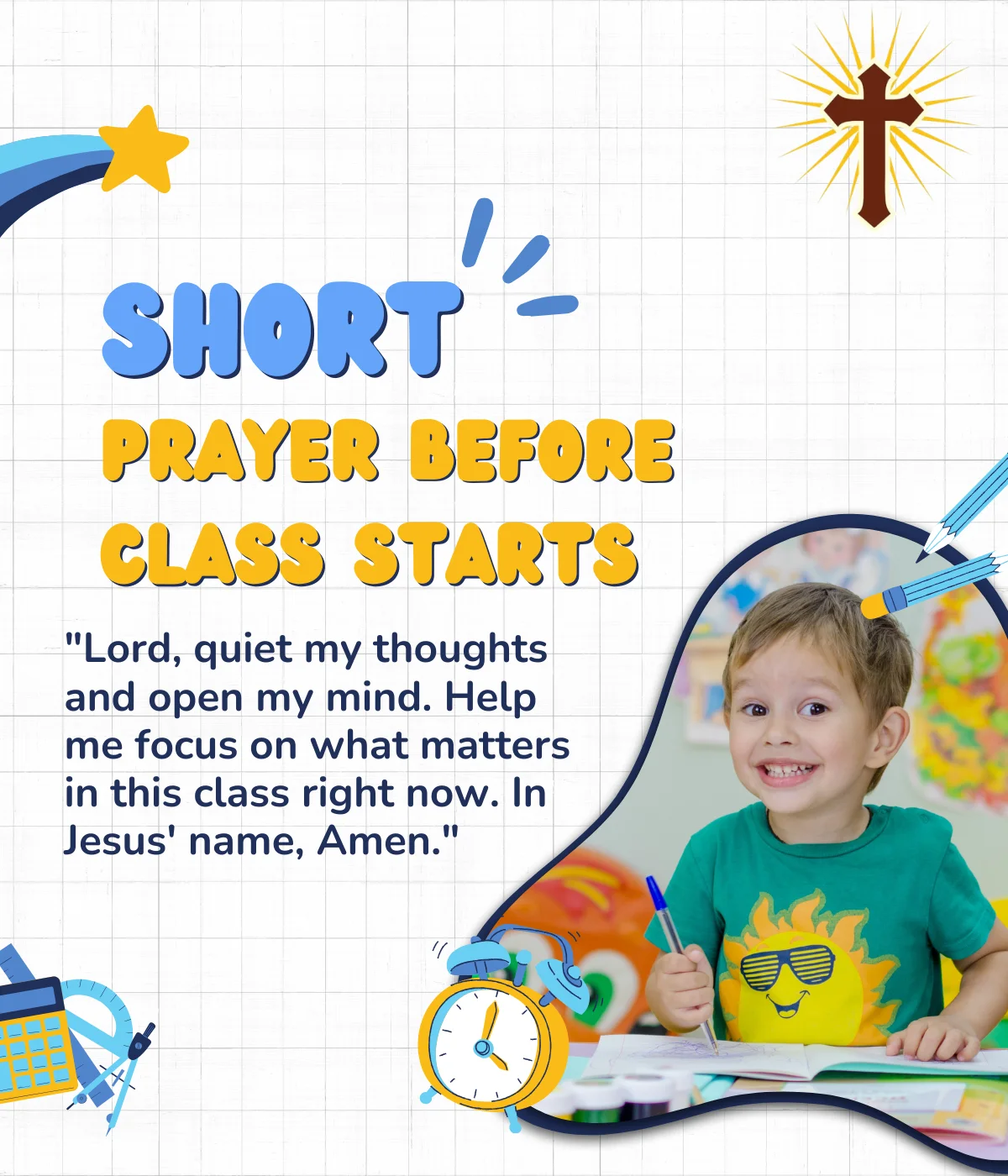 A good short prayer is honest, specific, and spoken in faith. It doesn’t need formal language. Something like Lord, help me focus, stay calm, and be kind today at school. Amen.”